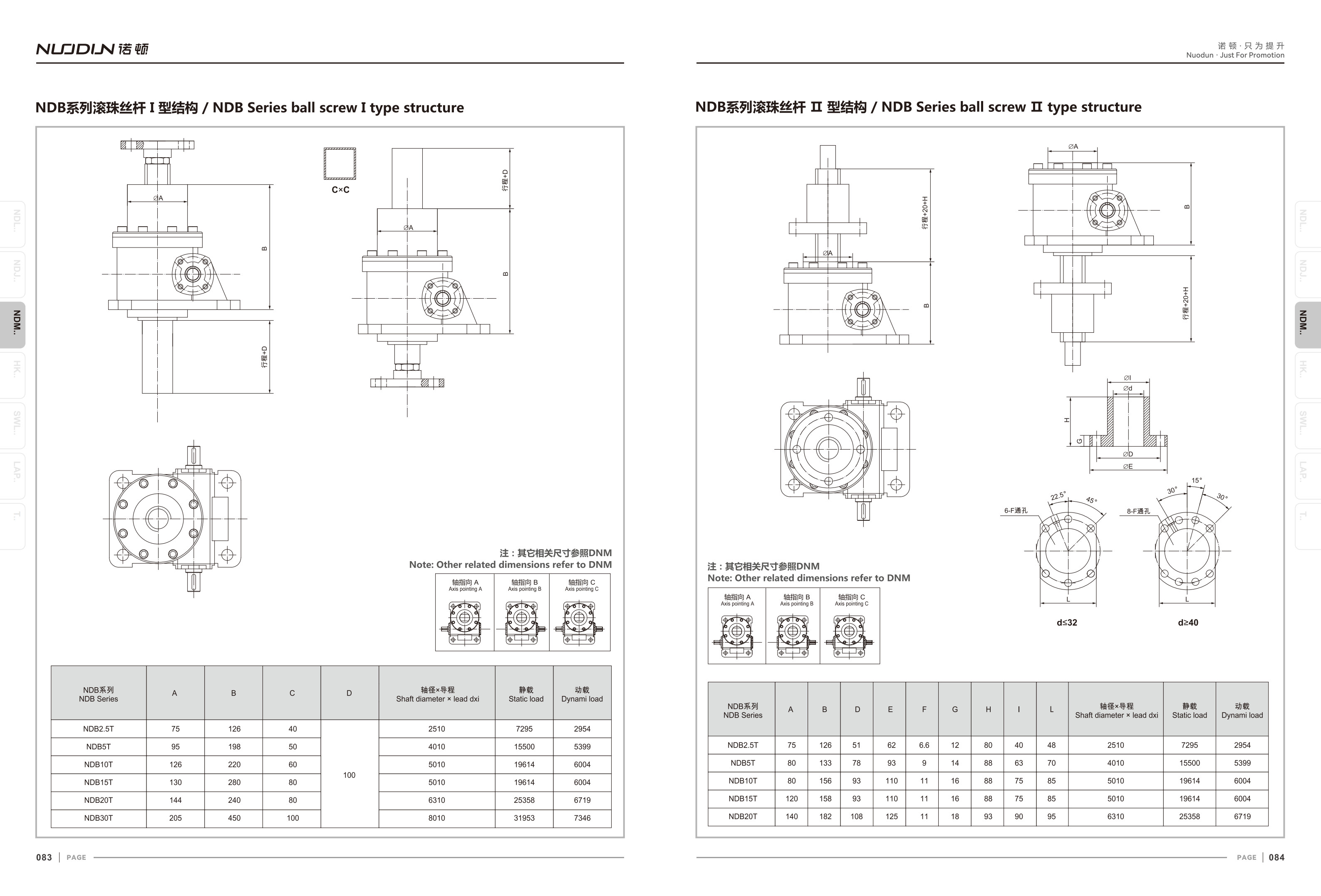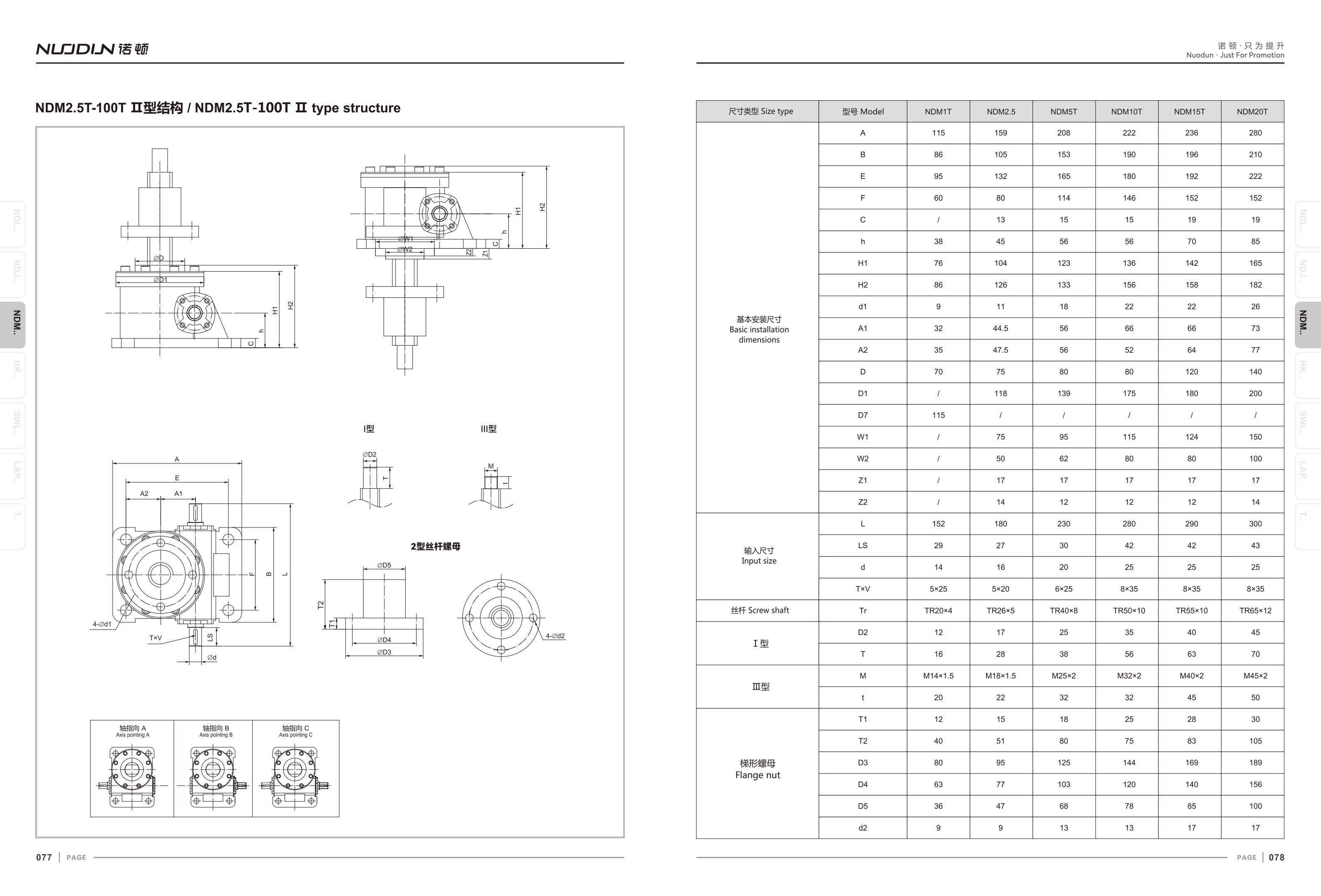 The product range includes capacities from 1T to 100T, supporting both translating screw type (Type 1) and rotating screw type (Type 2) structures. Multiple screw-tip end forms, upward or downward installation (A / B type), anti-rotation options, protective covers, and fully customized stroke lengths allow the NDM screw jacks to integrate seamlessly into a wide range of industrial systems.